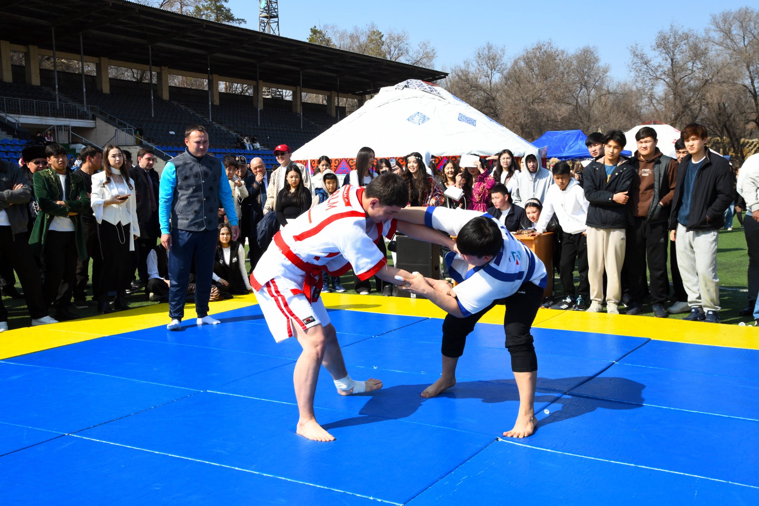 Университет ұжымы мен студенттері бұл мейрамды ашық аспан астындағы кең стадиондаэтно-ауыл форматында атап өтті. Сап түзеген ақ шаңқан киіз үйлер, буы бұрқыраған дәм мен ұлттық киім киген қауымның жүзіндегі қуаныш бұл аумақты қазақтың байырғы дәстүрі мен заманауи жастық жалыны тоғысқан үлкен думан ошағына айналдырды. Мерекелік іс-шара студенттердің шығармашылық әлеуетін көрсетуге, ұлттық дәстүр мен өнерді дәріптеуге, білім ордасының рухани байлығын арттыруға мүмкіндік берді.